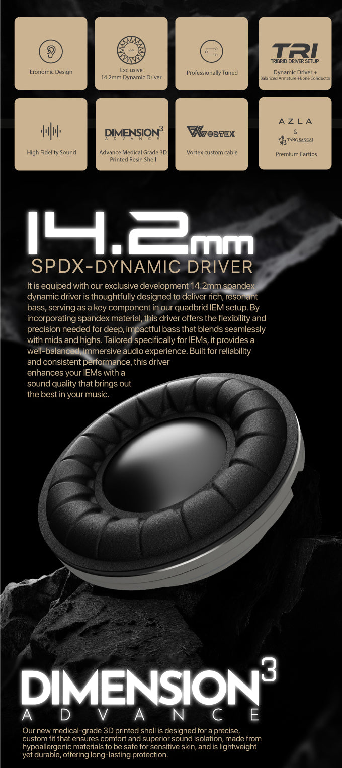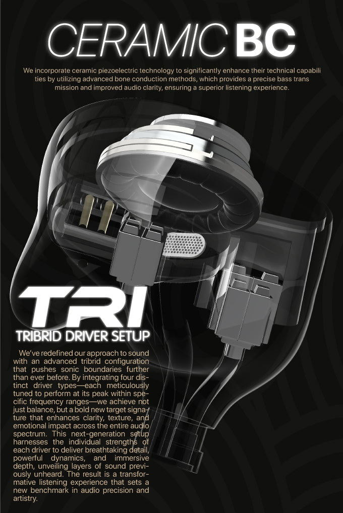 We redefine sound performance with advanced triple drive configuration and break through the boundaries of acoustics. By integrating four different types of drive units, each finely tuned to perform at peak performance in a specific frequency band. We not only achieve balance, but also create a new target sound that enhances clarity, texture, and emotional impact. The triple architecture effectively leverages the advantages of each unit, presenting amazing details, strong dynamics, and immersive depth, taking the sound level to a higher level than ever before, and setting a new benchmark for audio accuracy and artistry.
