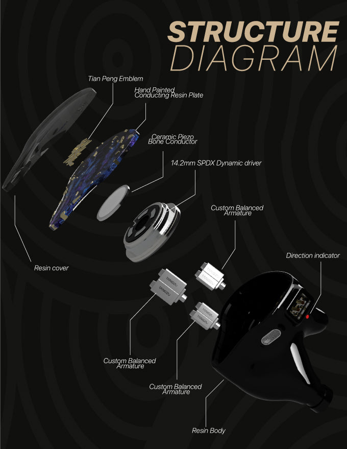 Tianpeng's dynamic coil unit uses our exclusive 14.2mm spandex silk silicone cloth diaphragm, which is carefully designed to provide clear and resonant bass and is a key component of the headphones. Through the spandex material, the dynamic coil unit provides deep, impactful bass and the flexibility and precision it requires, blending seamlessly with midrange and treble. Designed for in-ear, it provides a balanced and immersive audio experience. The main performance is reliable and consistent. In addition to improving the sound quality, it can also maximize the effect of the music itself.