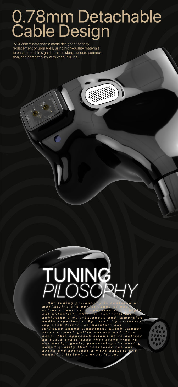 The 0.78mm replaceable headphone cable is used to facilitate replacement and upgrade of the cable. High-quality materials ensure stable signal transmission, stable connection, and compatibility with various earplugs.