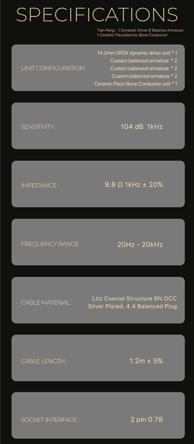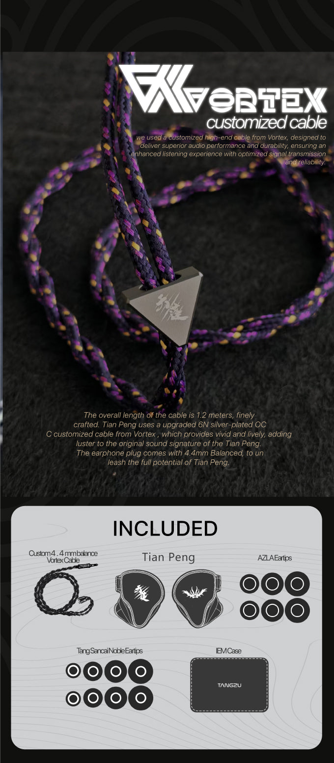 The total length is 1.2 meters and is finely crafted. Tianpeng is equipped with an upgraded version of 6N single crystal oxygen-free copper silver-plated wire, which has a vivid and textured sound and enhances the original sound performance. Equipped with a 4.4mm balanced plug, it fully releases the potential of Tianpeng