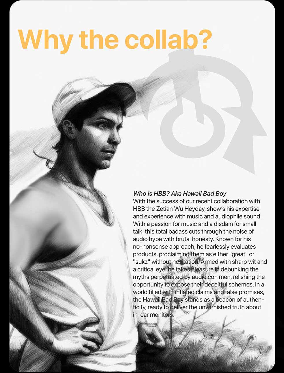 With the success of our recent collaboration with HBB the Zetian Wu Heyday, show’s his expertise and experience with music and audiophile sound. With a passion for music and a disdain for small talk, this total badass cuts through the noise of audio hype with brutal honesty. Known for his no-nonsense approach, he fearlessly evaluates products, proclaiming them as either "great" or "sukz" without hesitation. Armed with sharp wit and a critical eye, he takes pleasure in debunking the myths perpetuated by audio con men, relishing the opportunity to expose their deceitful schemes. In a world filled with inflated claims and false promises, the Hawaiian Bad Boy stands as a beacon of authenticity, ready to deliver the unvarnished truth about in-ear monitors.