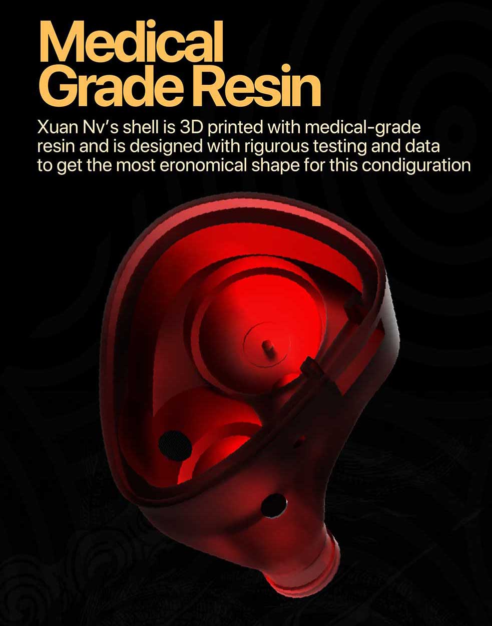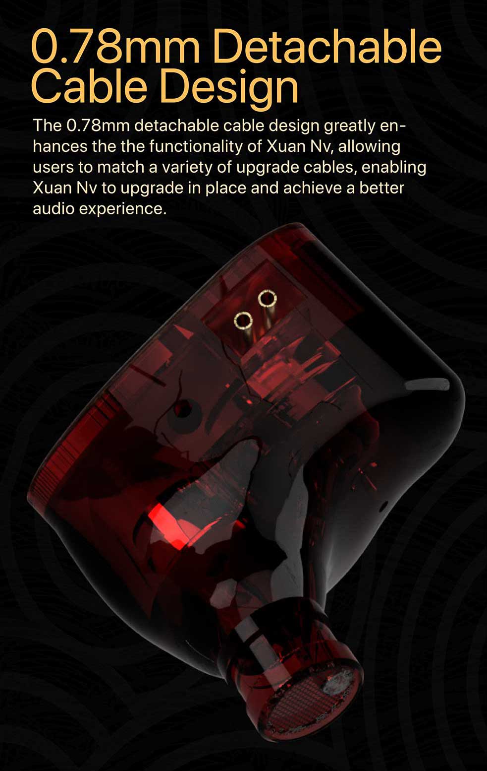 The 0.78mm detachable cable design greatly enhances the the functionality of Xuan Nv, allowing users to match a variety of upgrade cables, enabling Xuan Nv to upgrade in place and achieve a better audio experience.