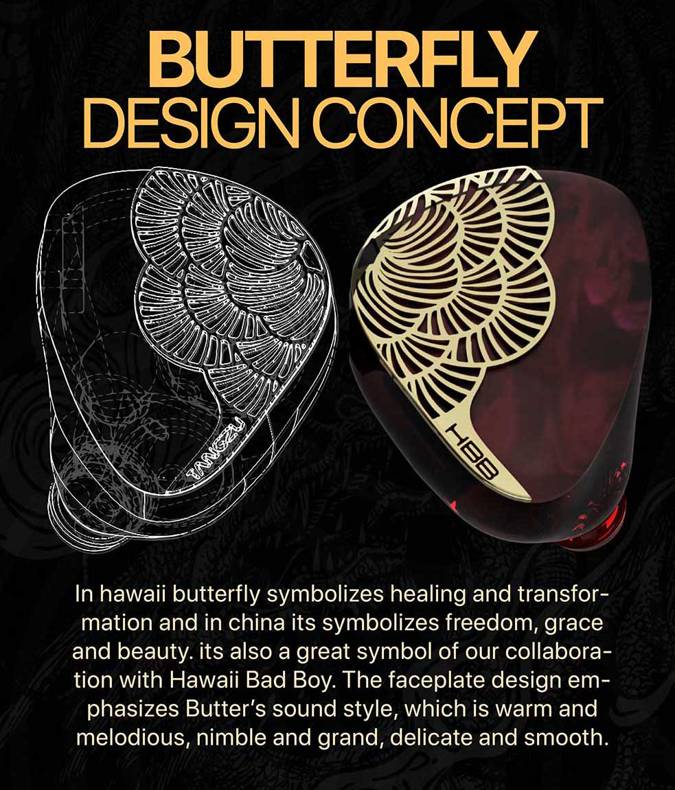 In hawaii butterfly symbolizes healing and transformation and in china its symbolizes freedom, grace and beauty. its also a great symbol of our collaboration with Hawaiian Bad Boy. The faceplate design emphasizes Butter’s sound style, which is warm and melodious, nimble and grand, delicate and smooth.