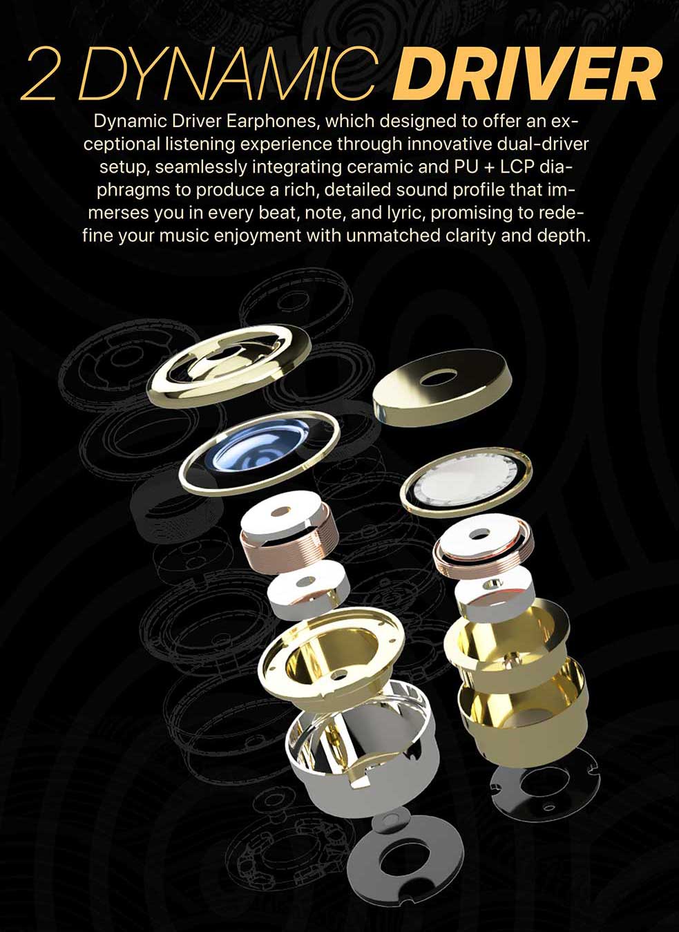 Dynamic Driver Earphones, which designed to offer an exceptional listening experience through innovative dual-driver setup, seamlessly integrating ceramic and PU + LCP diaphragms to produce a rich, detailed sound profile that immerses you in every beat, note, and lyric, promising to redefine your music enjoyment with unmatched clarity and depth.