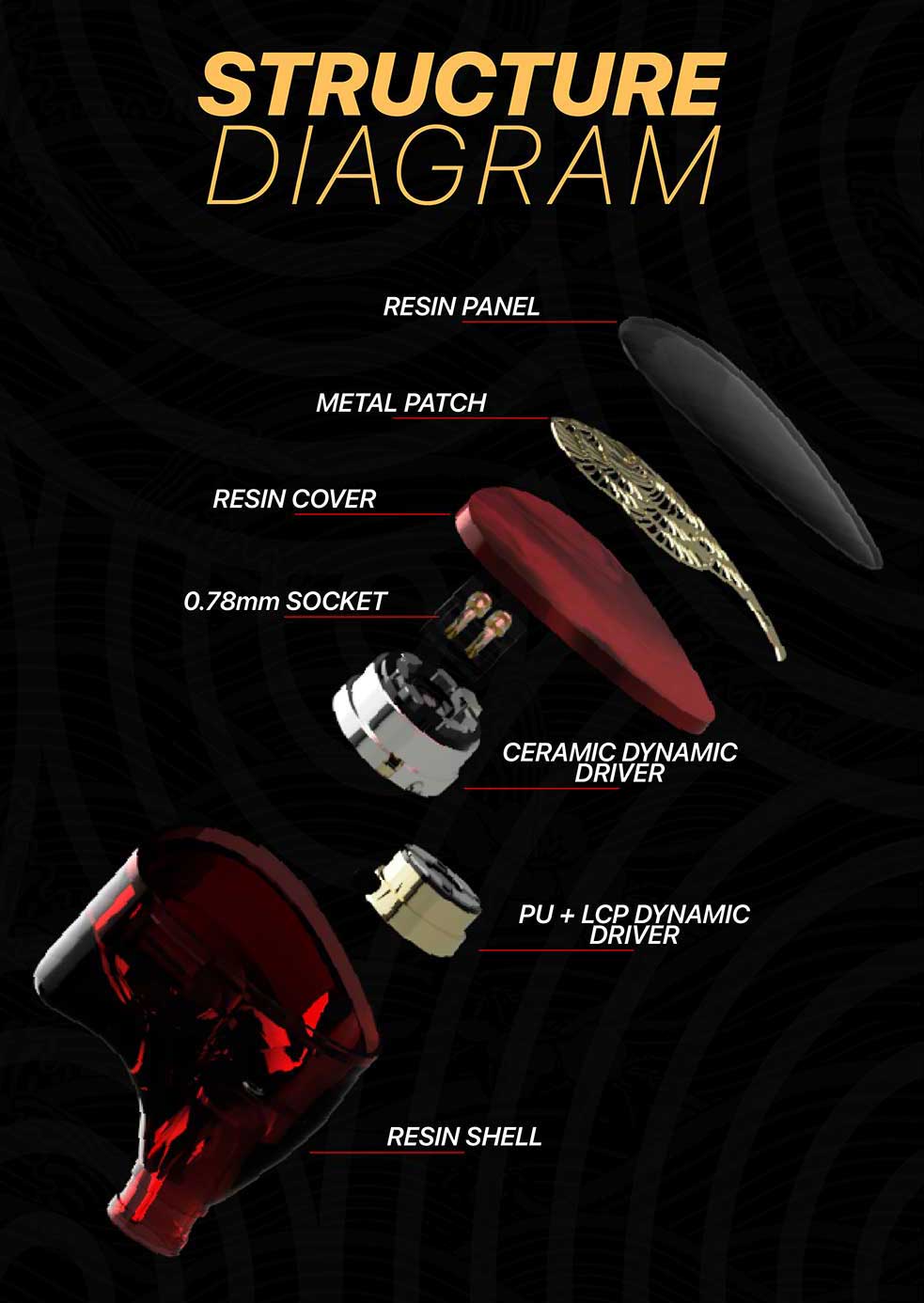 • UNIT CONFIGURATION :10mm Ceramic Dynamic driver unit * 1;8mm PU + LCP Dynamic driver unit * 1
