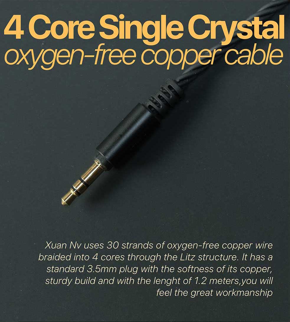 Xuan Nv uses 30 strands of oxygen-free copper wire braided into 4 cores through the Litz structure. It has a standard 3.5mm plug with the softness of its copper, sturdy build and with the lenght of 1.2 meters,you will feel the great workmanship